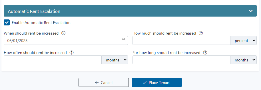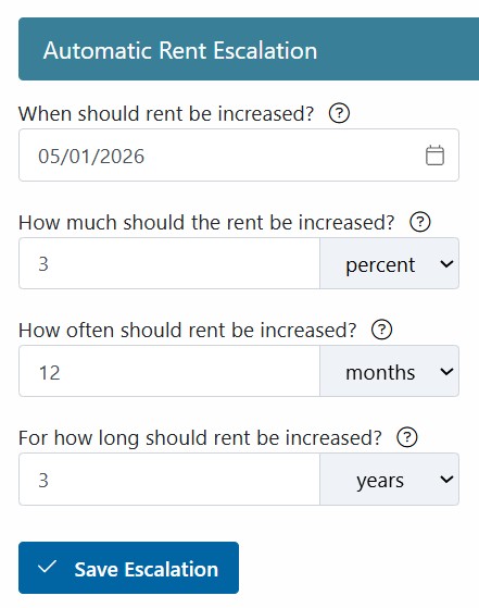 After a tenant has been moved into a property, you can easily set up Automatic Rent Escalations based on your lease agreement.