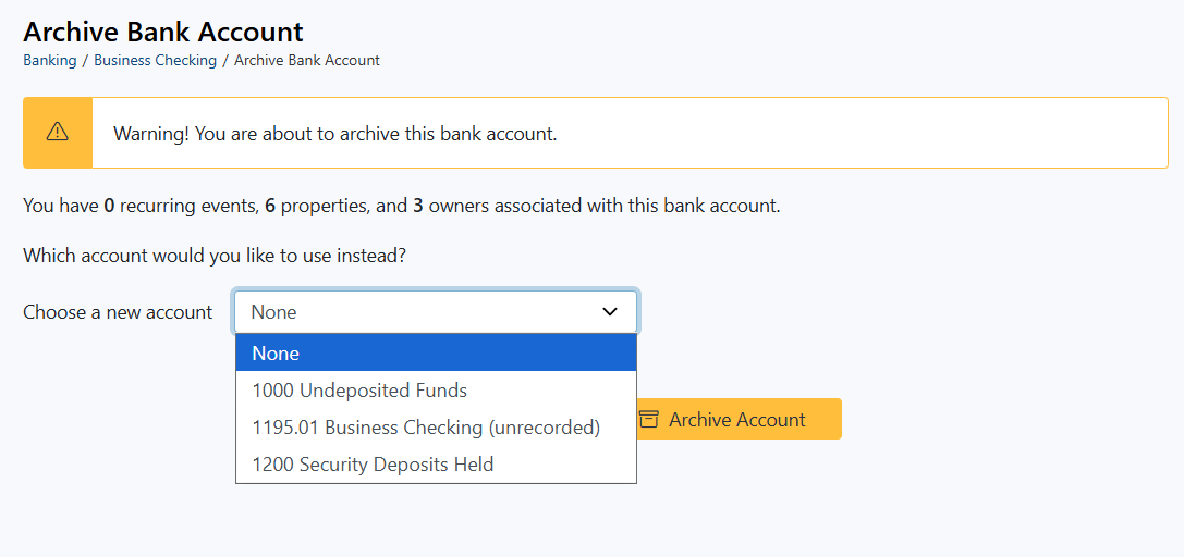 - A warning will be displayed if there are any recurring transactions, properties, or owners associated with the bank account. If the account is being replaced with another account: