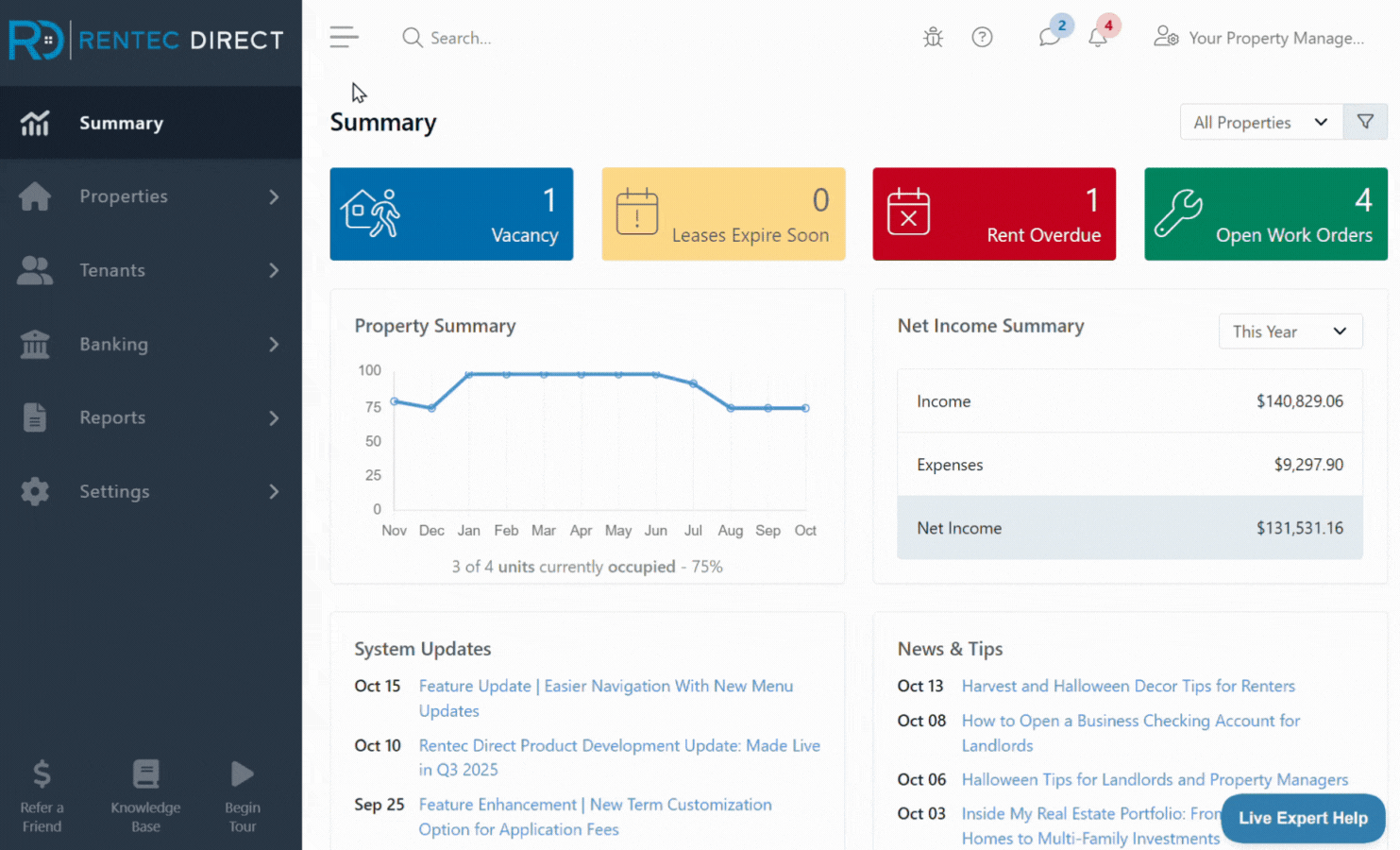 Your Summary page is the first page you land on when you log in to your Rentec Direct software and is the hub for at-a-glance details of your rental portfolio, areas of your property management that may require action, and Rentec Direct System Updates and News. This article reviews the following topics: click directly on a link to jump to that section: