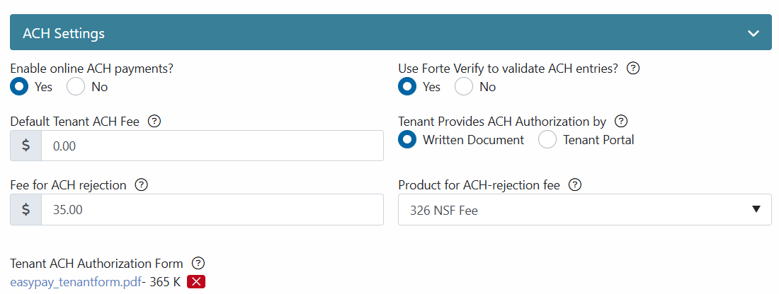 - Enable online ACH payments - This must be set to Yes for tenants to pay rent by ACH