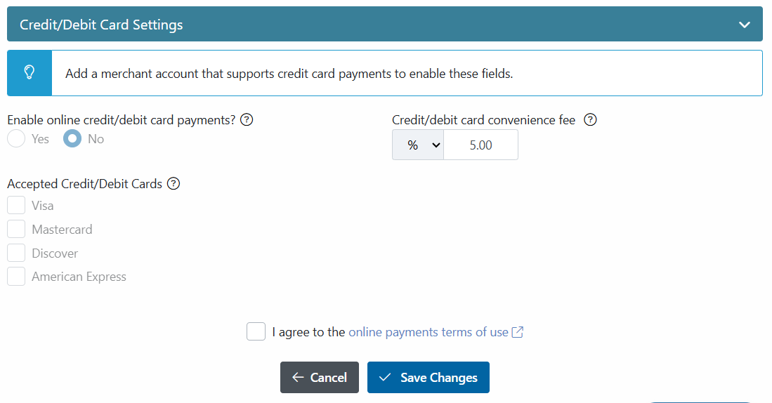 Tip: Further in these steps, under Credit/Debit Card Settings, you can indicate a convenience fee that you charge to the tenant to reimburse yourself for the expense
