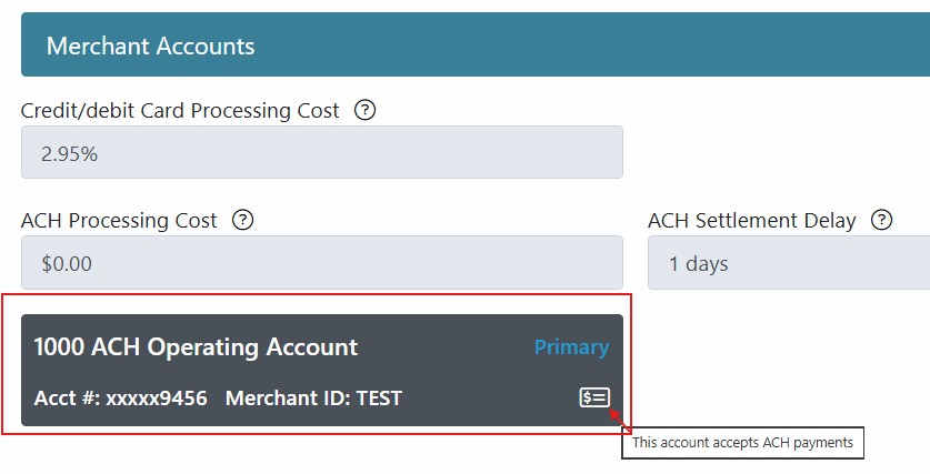 3. Under Merchant Accounts, check to see if there is a bank account indicated and if there is a check and/or card image in the lower right corner. This will let you know which bank accounts are linked to merchant accounts and the approved type of transactions.