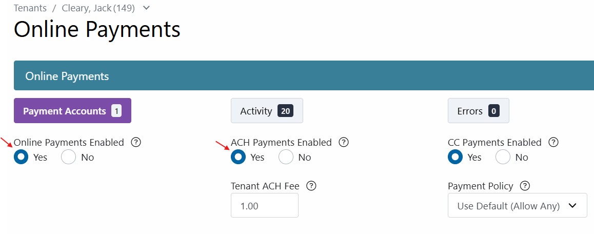 3. Confirm the individual tenant's online payment settings are set to allow ACH transactions.