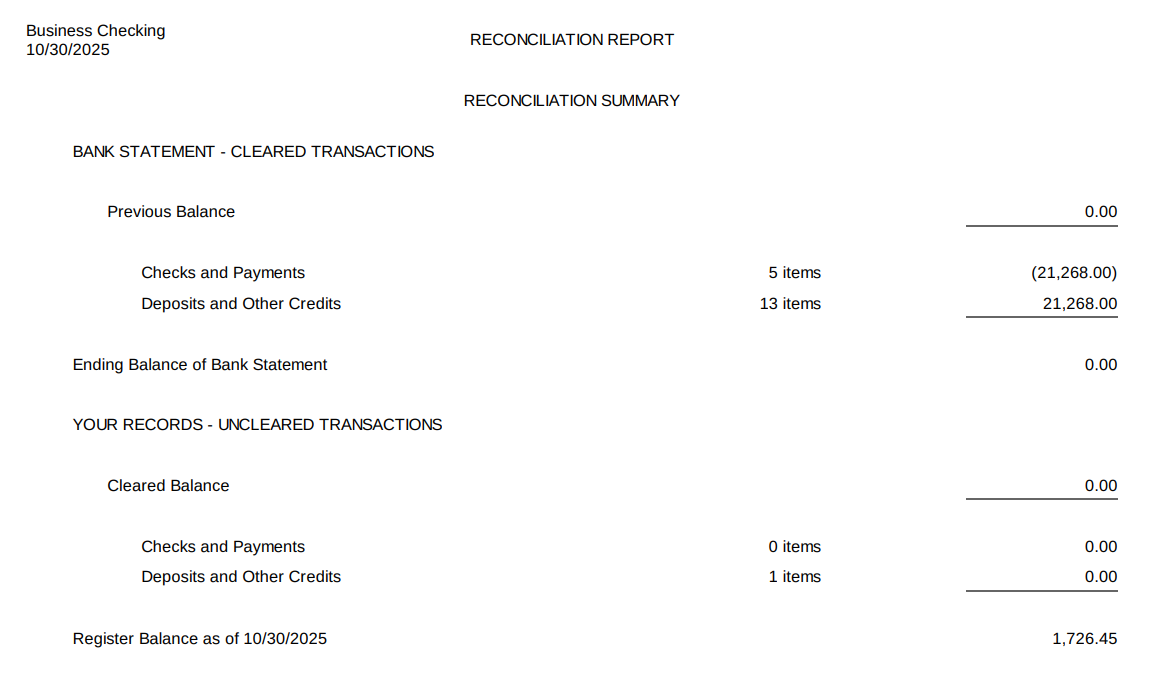 - Reconciliation Summary: A summary of reconciled and uncleared transactions