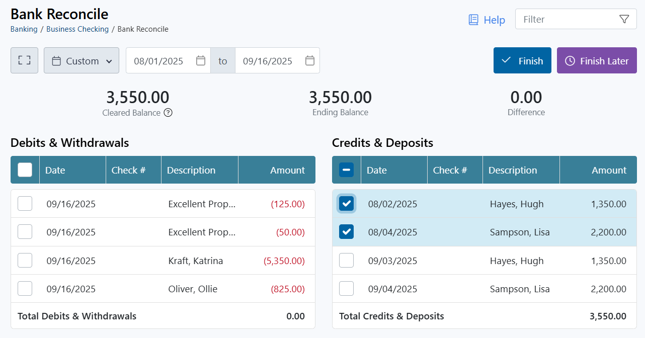 - Long Method: Compare the debits on the left and credits on the right against your bank statement and mark the checkbox next to each matching item.