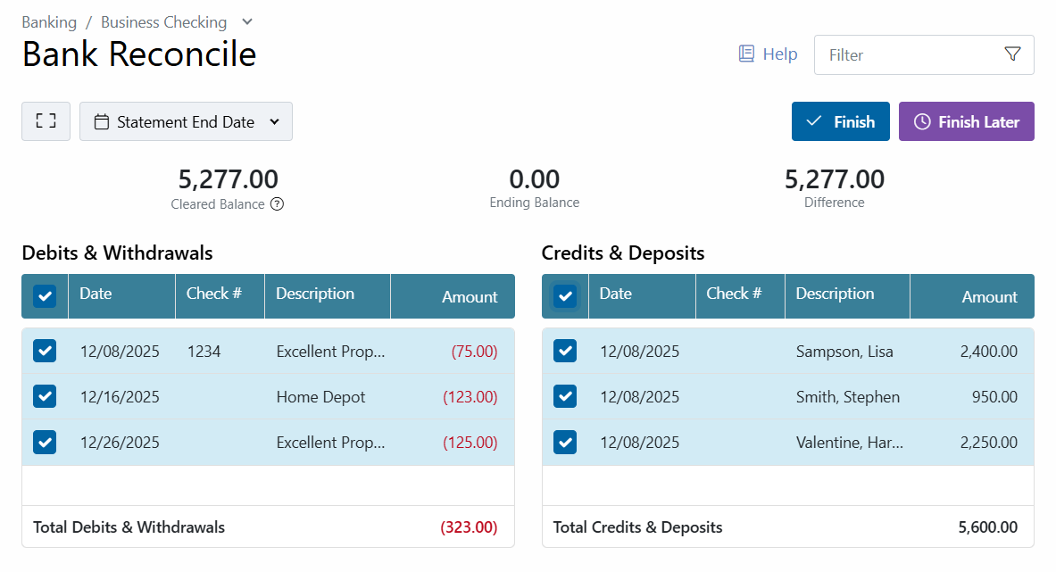 - Make note of any transactions that appear on your statement that are not on your Rentec ledger, and click Finish Later