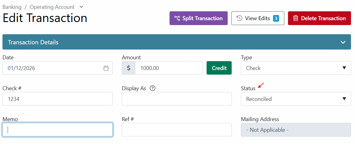 If you inadvertently marked a transaction as reconciled and wish to reverse it, or the reconciliation occurred before December 14, 2020, each line item will need to be edited individually.
