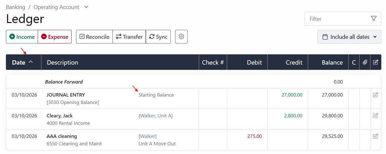 The starting balance will be the first transaction in the ledger, and all future transactions associated with this ledger will appear in either the debit or credit columns with a running Balance column.