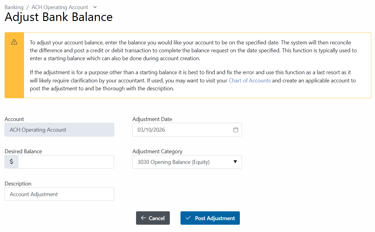 Important Note: If the adjustment is for a purpose other than a starting balance, it's best to find and fix the error and use this function as a last resort.