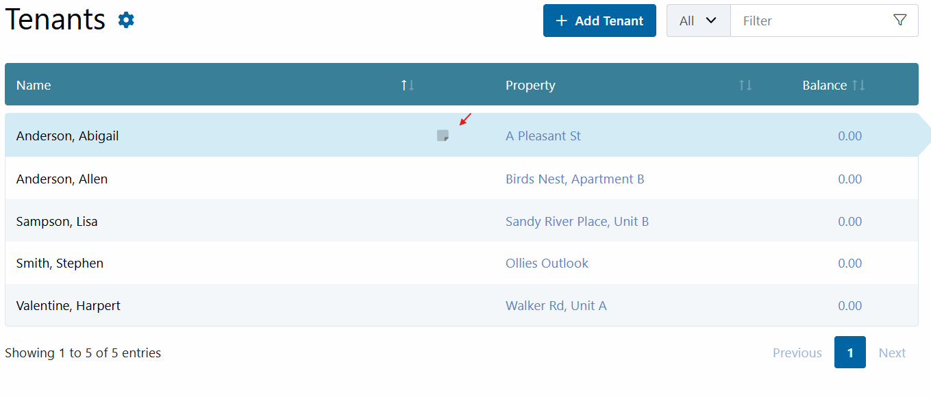 When a sticky note has been added, the icon shown in the screenshot below will appear next to the property or tenant on the list and on their Info Card as a Feature.