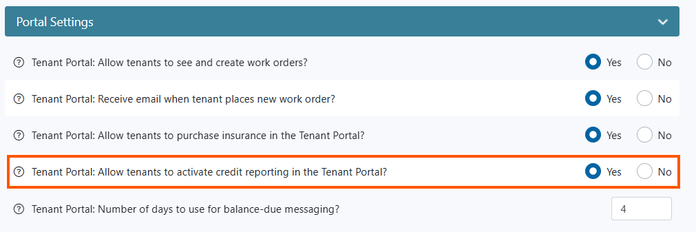 - Under Portal Settings, set Allow tenants to activate credit reporting in the Tenant Portal to Yes
