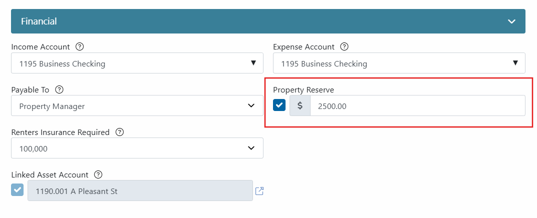 Under Financial, check the Property Reserve checkbox and enter the dollar amount to hold.