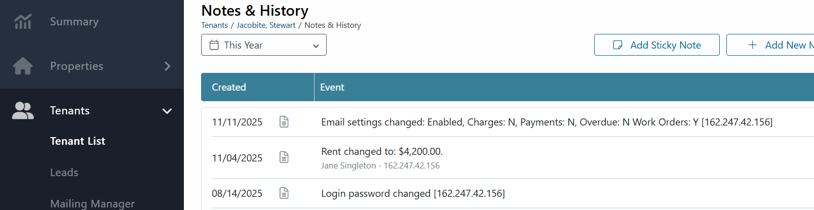You can view if tenants have changed notification settings through their portal in Notes & History