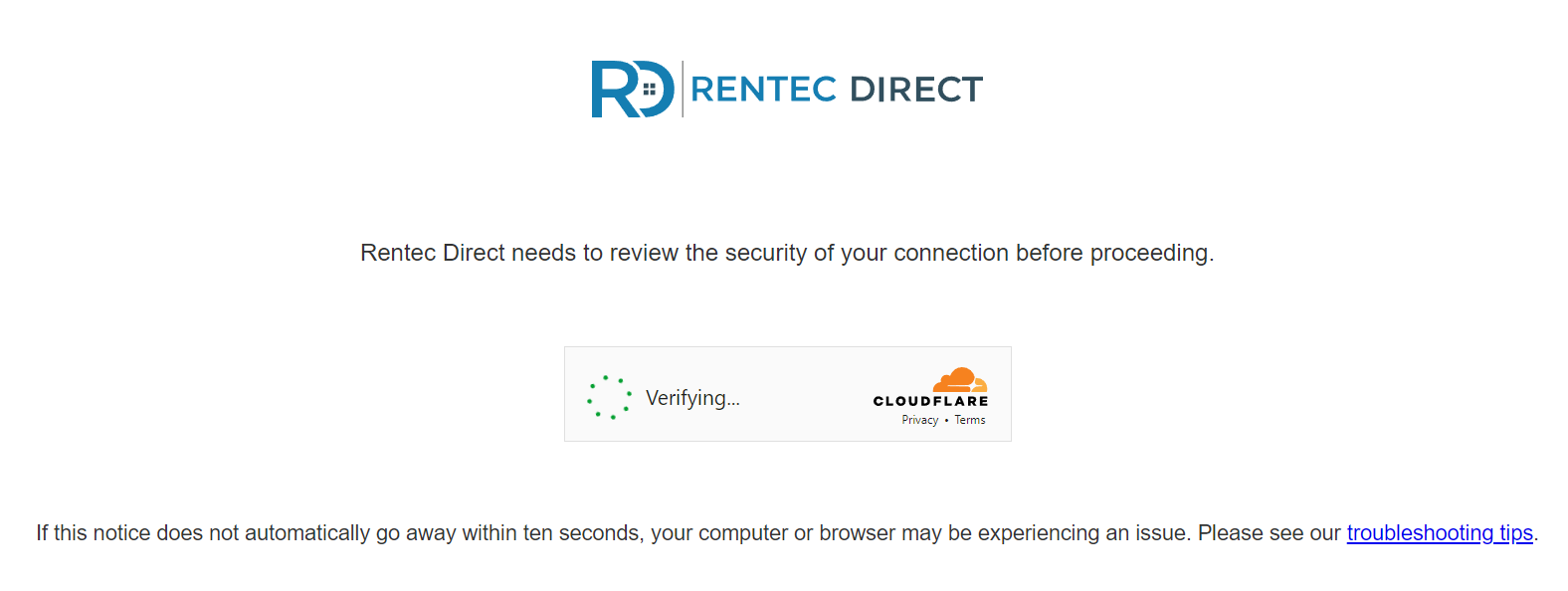If you access the login page directly from the Rentec Direct website, the system will need to review the security of your connection, and you will see the image below. If your browser or app does not navigate to the login page within 10 seconds, it may be experiencing a malfunction. Proceed to the general troubleshooting steps below.