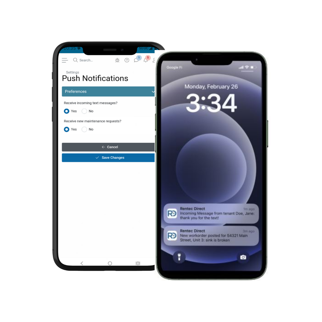 Rentec Direct's Push Notifications allow mobile app users (Pro and PM versions) to handle important communications—such as maintenance requests and text responses—on the go, directly from their mobile devices, without needing to log in to a computer.