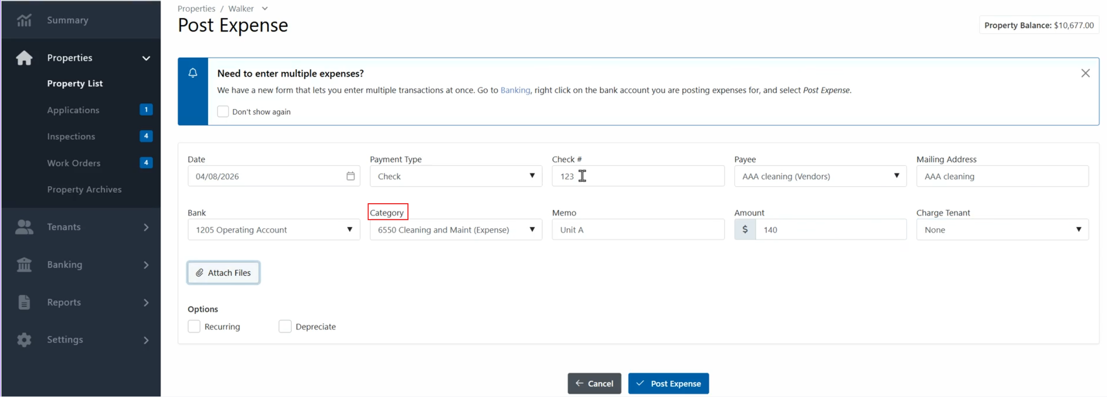 All the traditional accounts used in property management are added as default income and expenses. This includes the income categories Rental Income, Tenant-Reimbursed Expense, HOA Dues, and CAM Income. Expenses include Advertising, Utilities, Commissions, Repairs, and more...