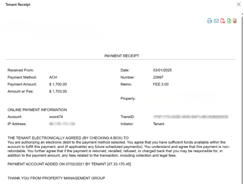 - Rent Payment Receipt: Includes the tenant's information, confirmation of electronic agreement selection, the fees included, and the terms they agreed to.