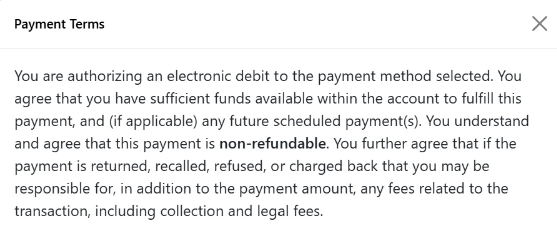 - Copy of a Tenant Payment Entry Screen: Verifies that tenants must agree to payment, fees, and payment terms.